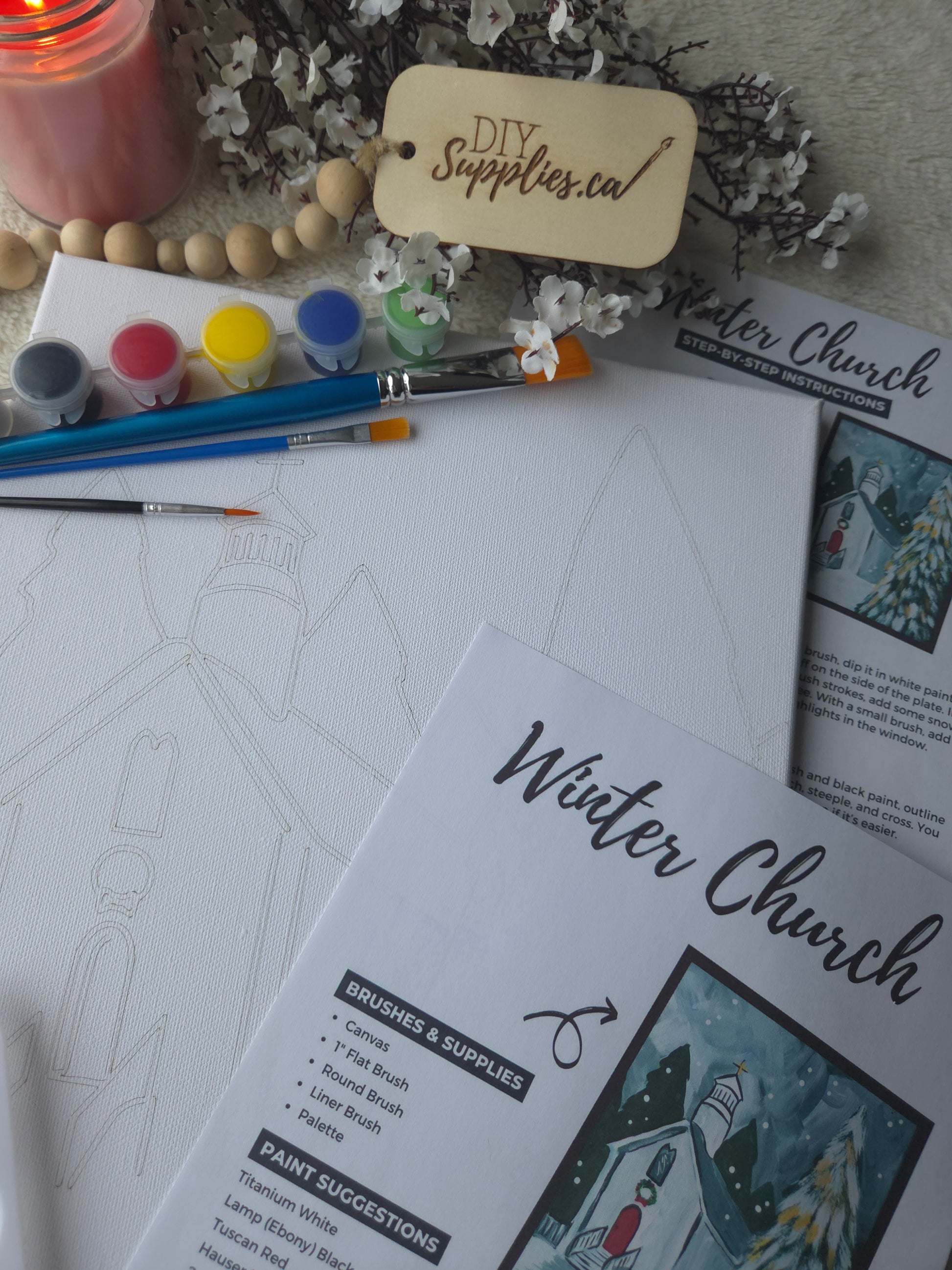 Enjoy a fun "Arty Party Paint" night with this beautiful canvas painting kit. This peaceful paint party kit features a charming country church nestled in a snowy winter scene, softly glowing against the night sky. It’s a serene and uplifting design that’s simple to paint and perfect for adding warm holiday spirit to your home. Build a party that's right for you. Select the number of guest kits you will need. Your price gets better the more guests you have. Get your party started!!!