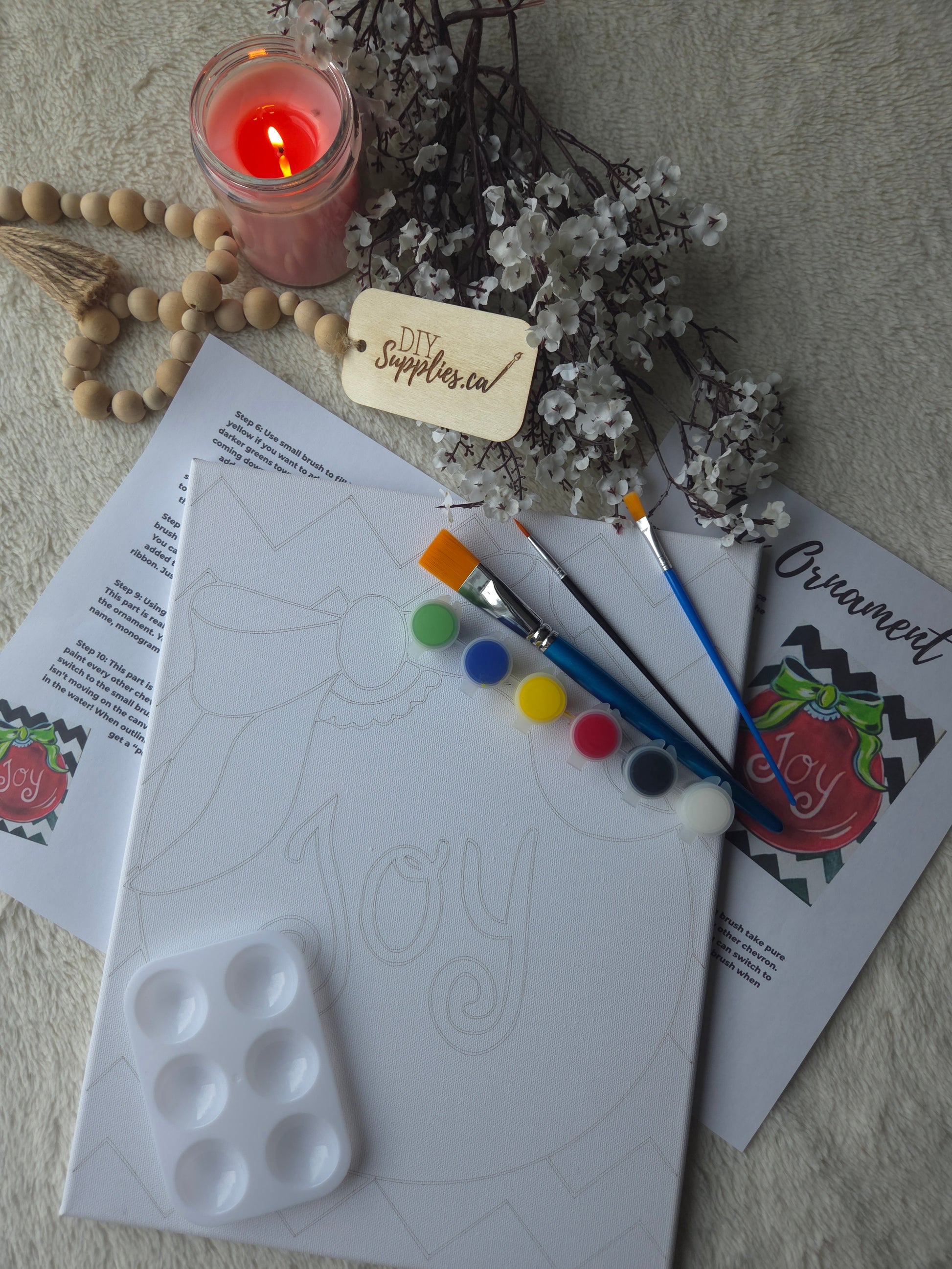 Enjoy a fun "Arty Party Paint" night with this beautiful canvas painting kit. This joyful paint party kit features a festive ornament design. Paint with bright colors and you will have a cheerful “JOY” centerpiece. It’s a fun, beginner-friendly project that brings instant holiday happiness to your décor. Build a party that's right for you. Select the number of guest kits you will need. Your price gets better the more guests you have. Get your party started!!!