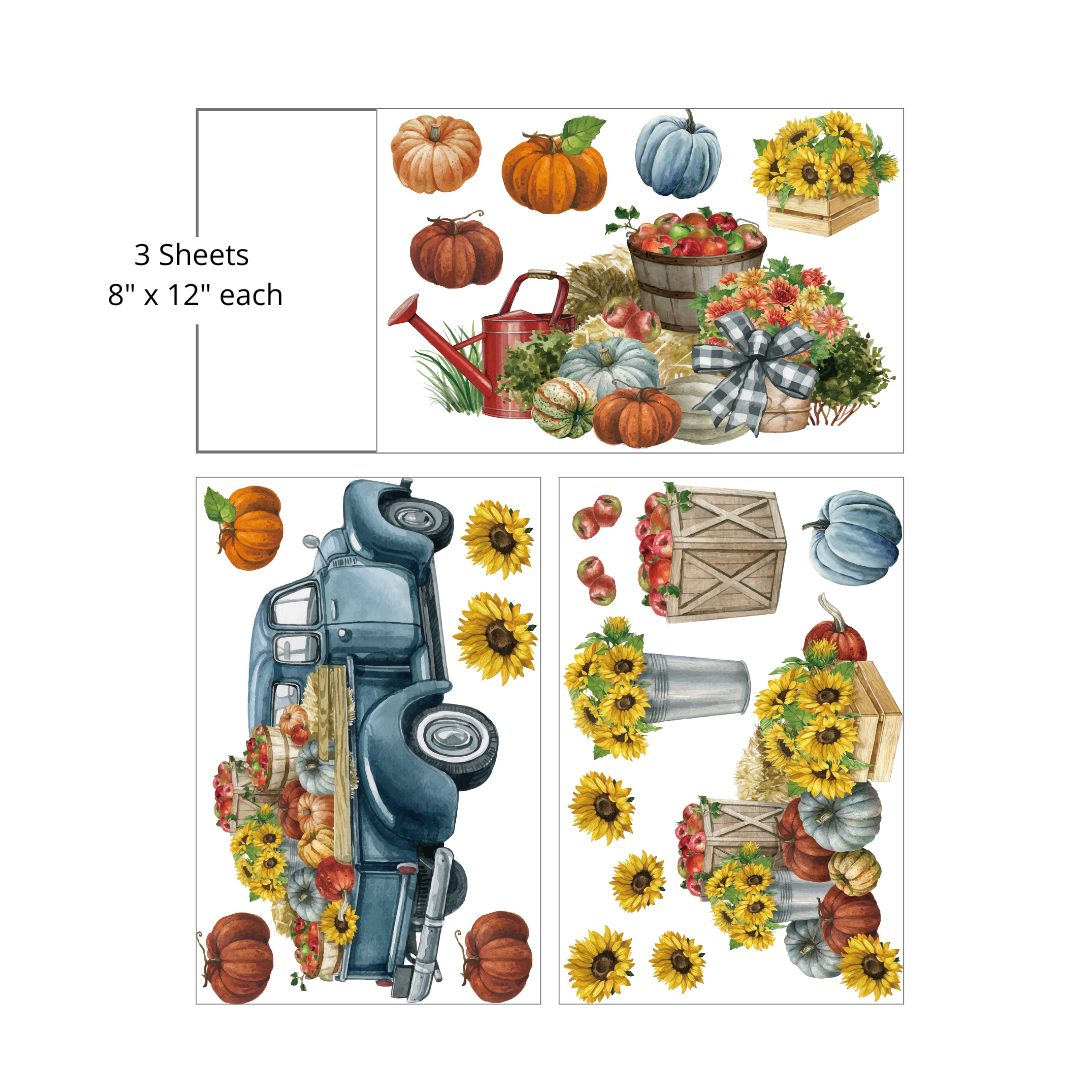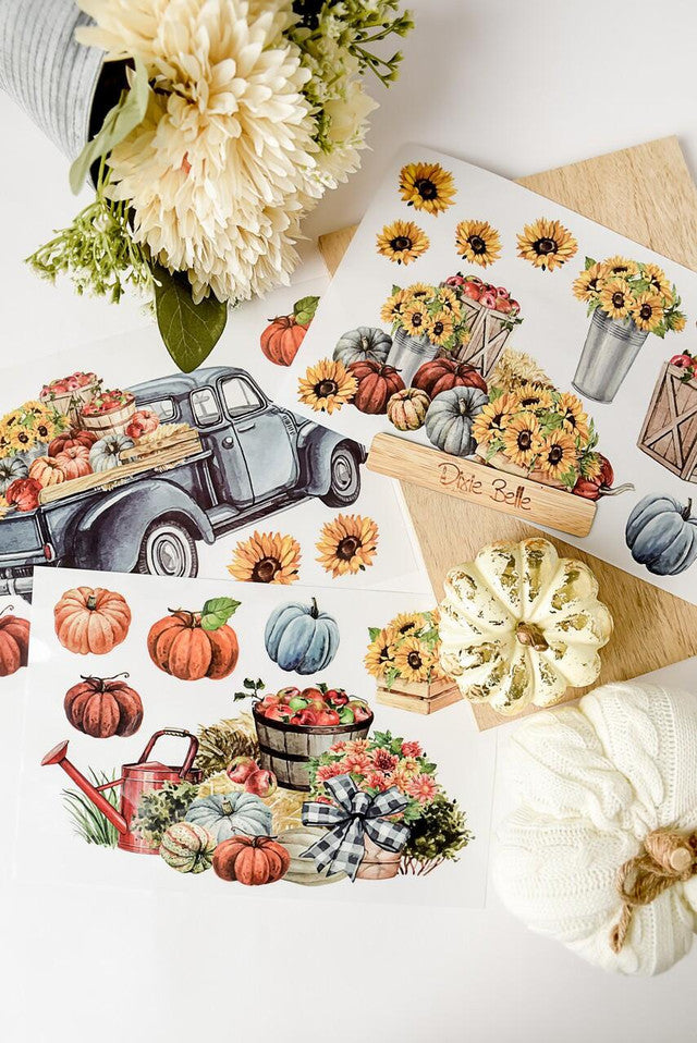 Embrace fall with the Country Pickin' Transfer, featuring a vintage truck loaded with daisies, pumpkins, and apple crates. Perfect for adding a rustic touch to your autumn projects, this mid-size transfer captures the essence of harvest time with ease and charm.