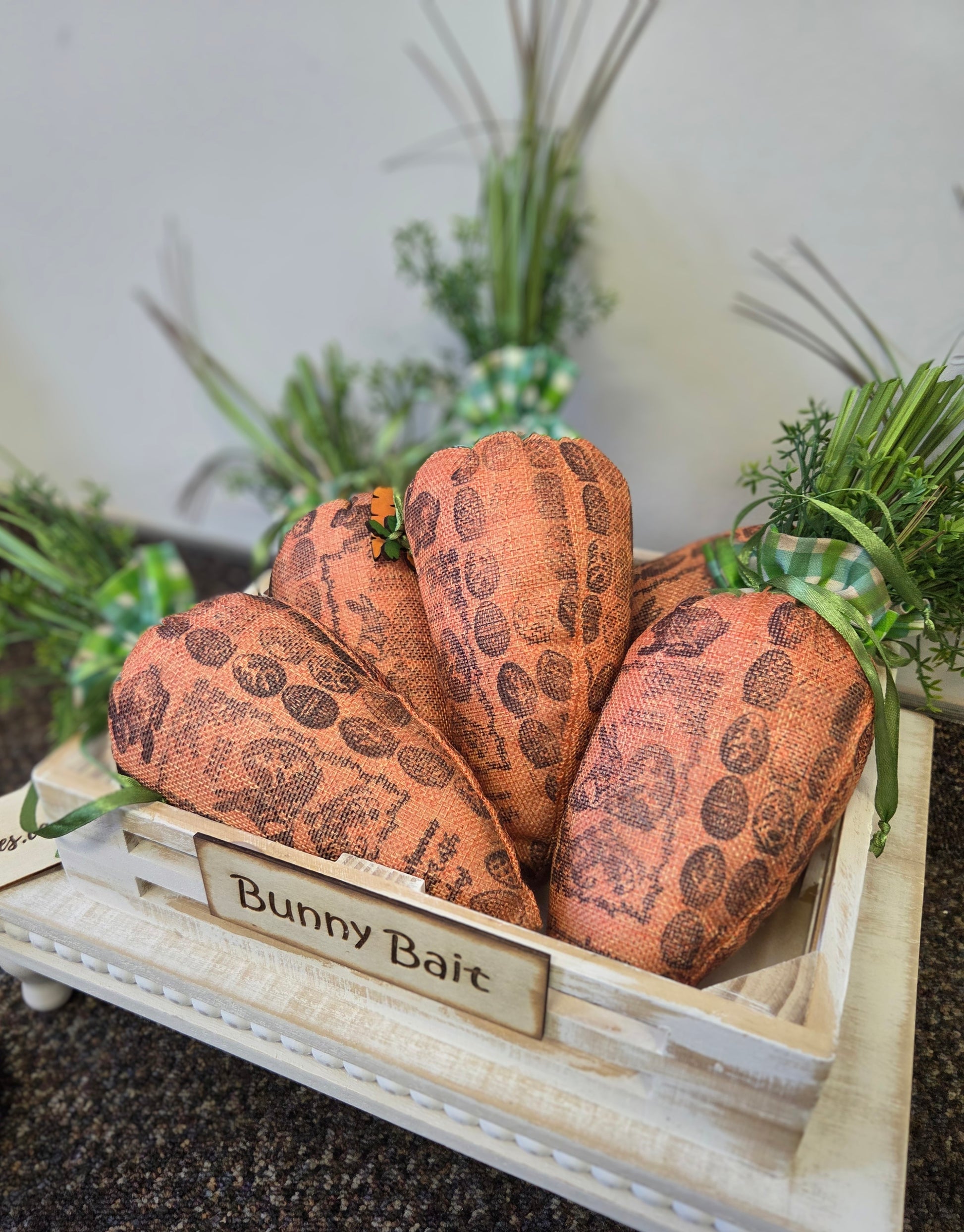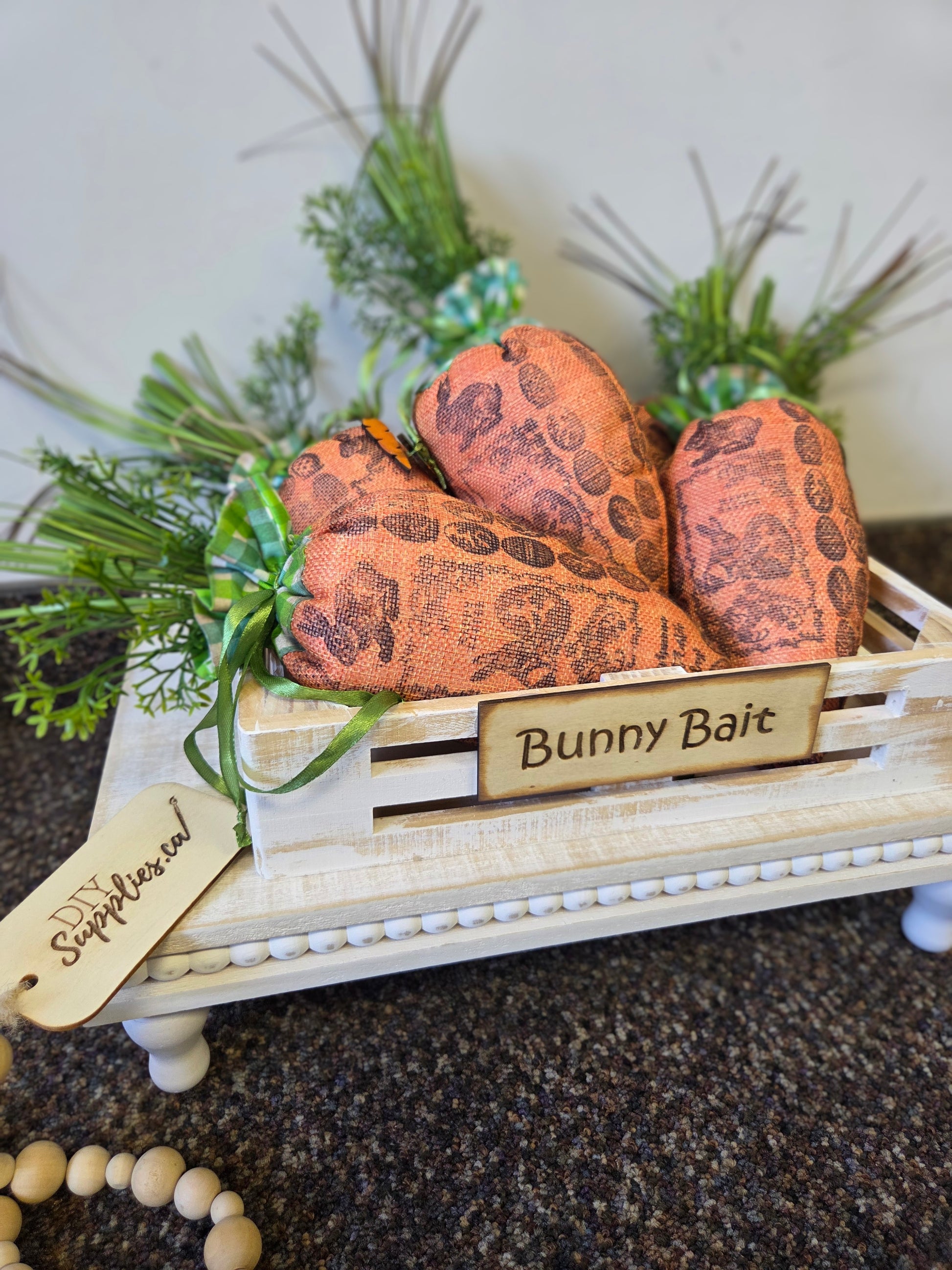 Bunny Bait Crate and Carrots. Crate is 10.5" x 11 inch x 3inch with 8" stuffed carrots. Teir tray in photo is not included but the crate is.