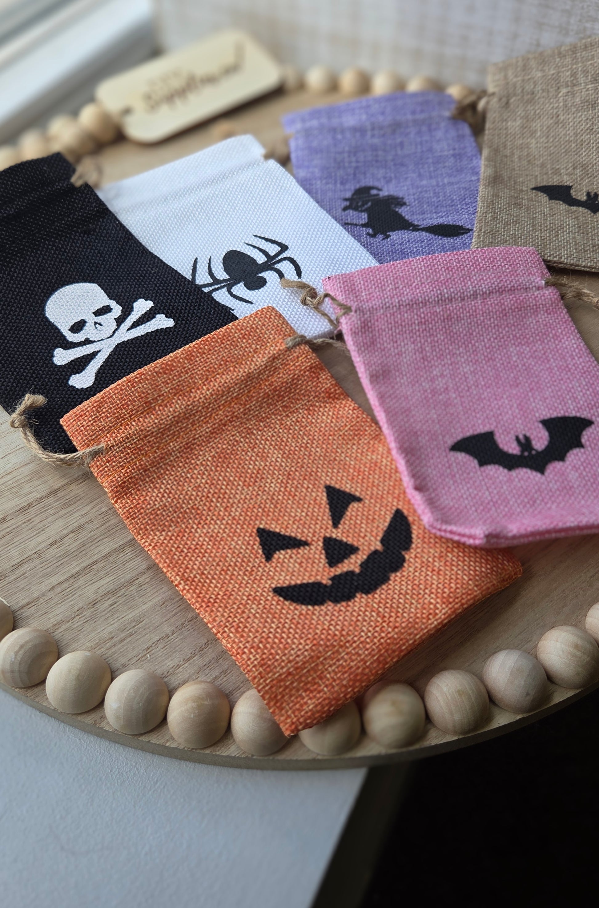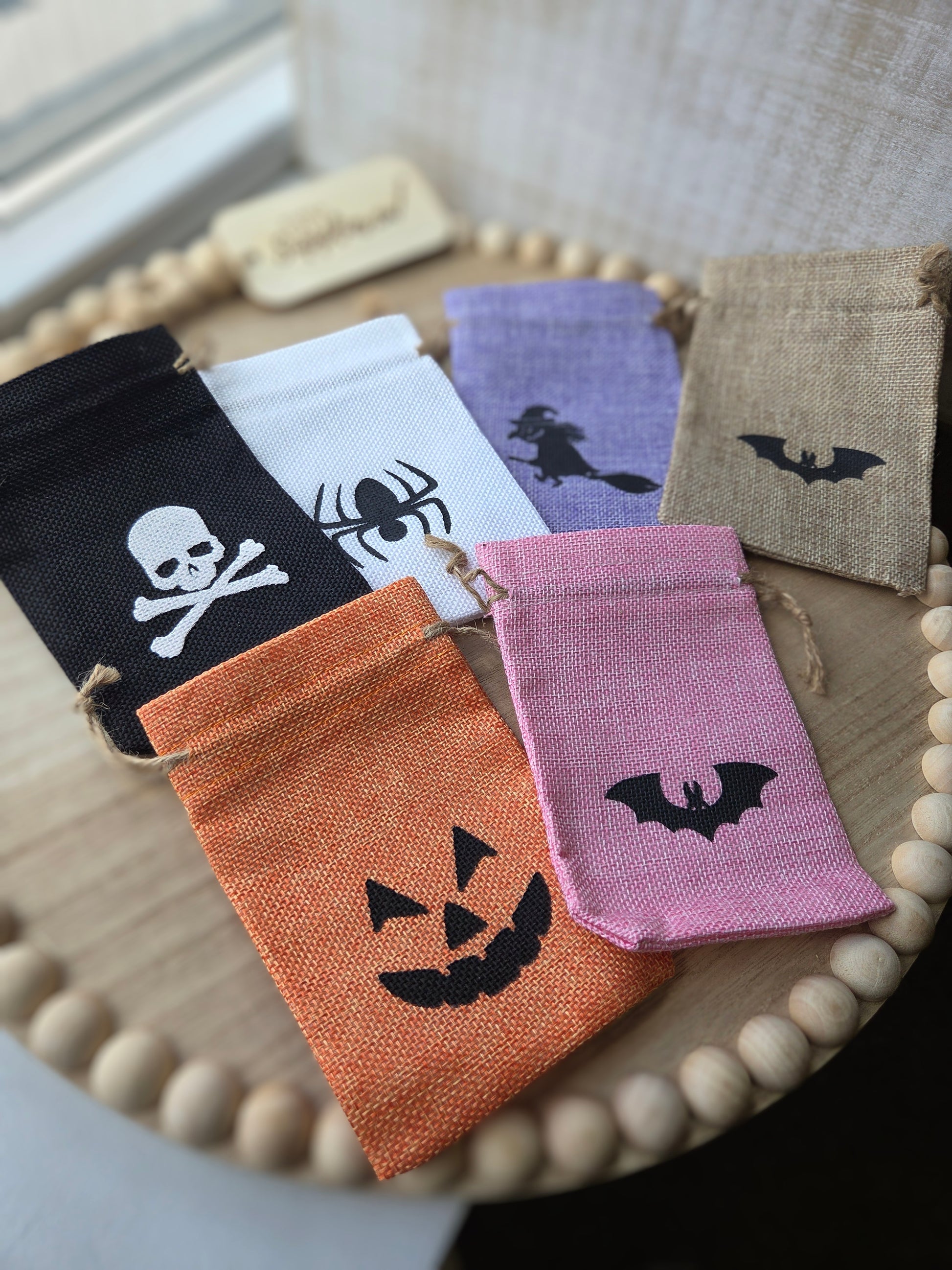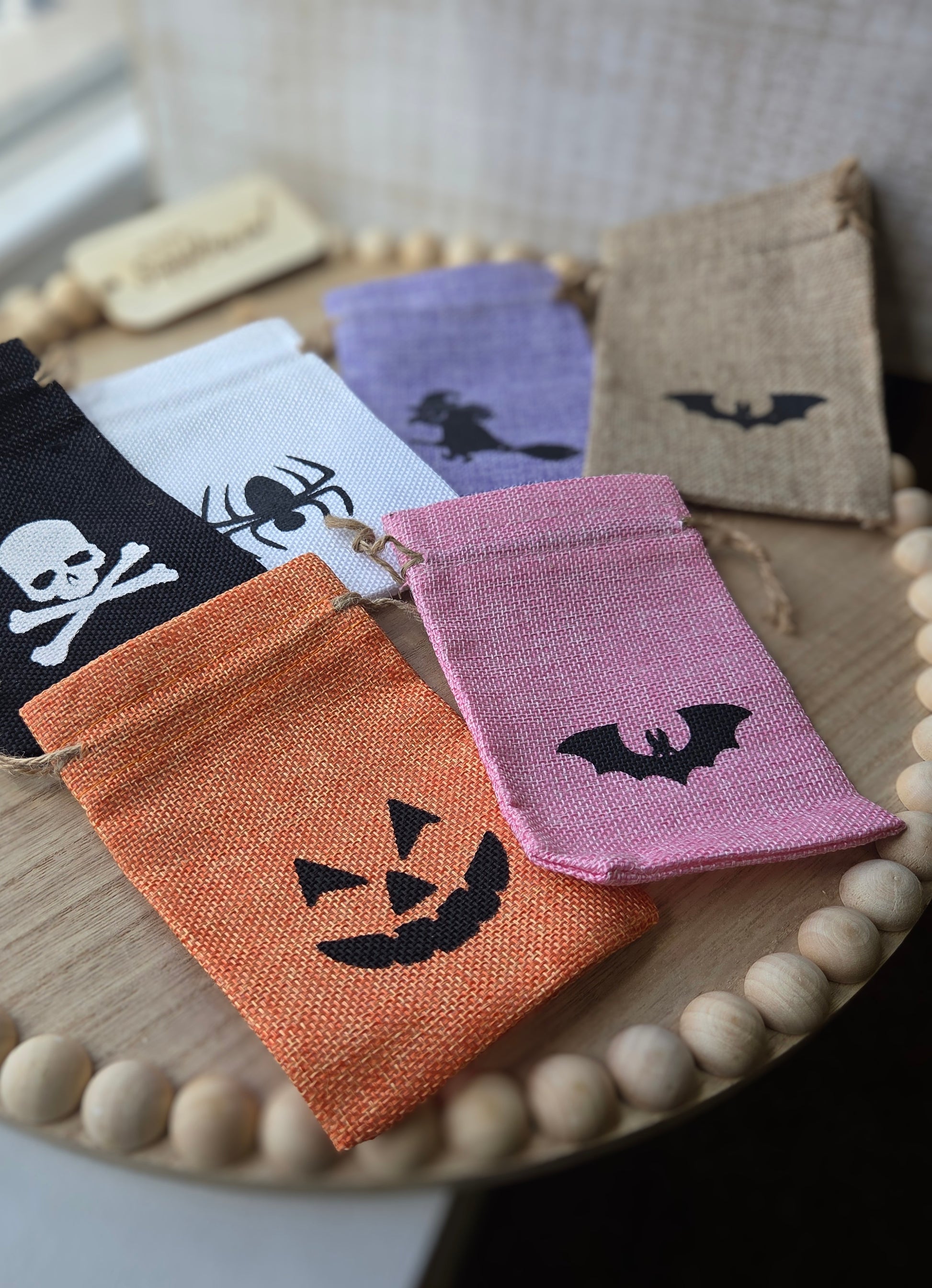 Burlap Halloween Bags Set of 24. Each bag is approx. 6 icn x 4 inch with drawstring. 6 colors in set as shown in photos