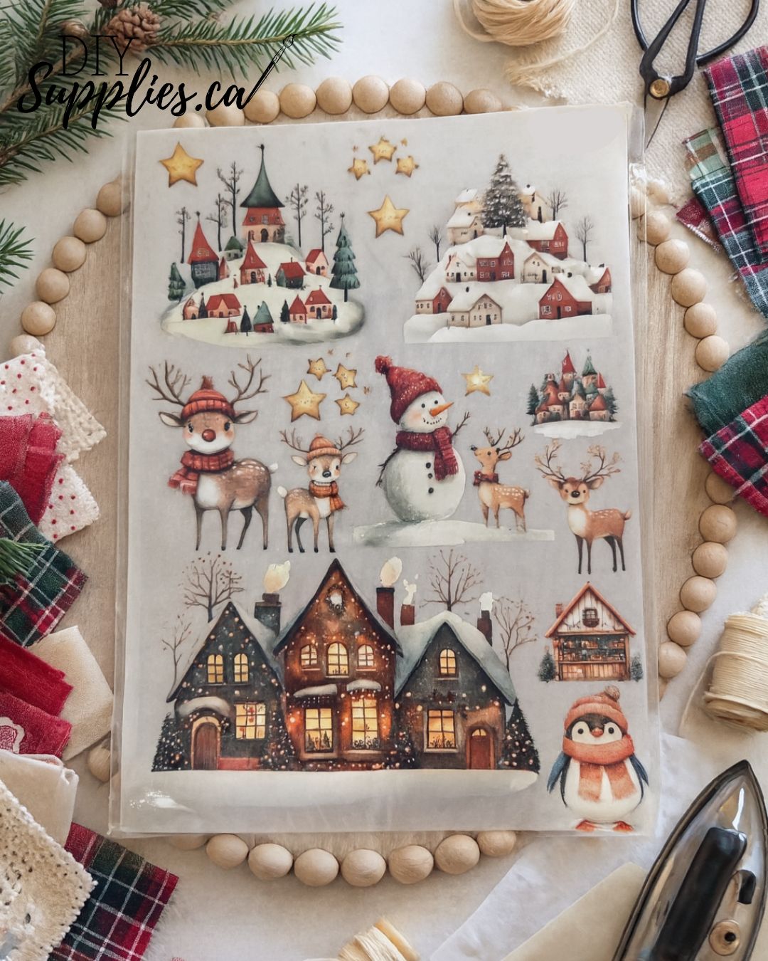 Bring festive charm to your holiday projects with this Christmas fabric transfer sheet! Featuring cozy villages, cute reindeer, a snowman, and more, these designs are perfect for shirts, stockings, tote bags, and DIY gifts. Simply cut out the design, place it face-down on your fabric, and iron with firm, even pressure until fully adhered. Easy, fast, and wonderfully festive for all your holiday crafting!