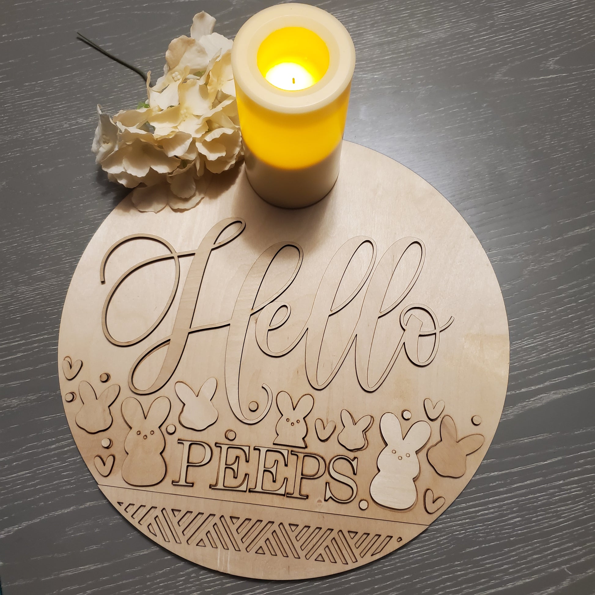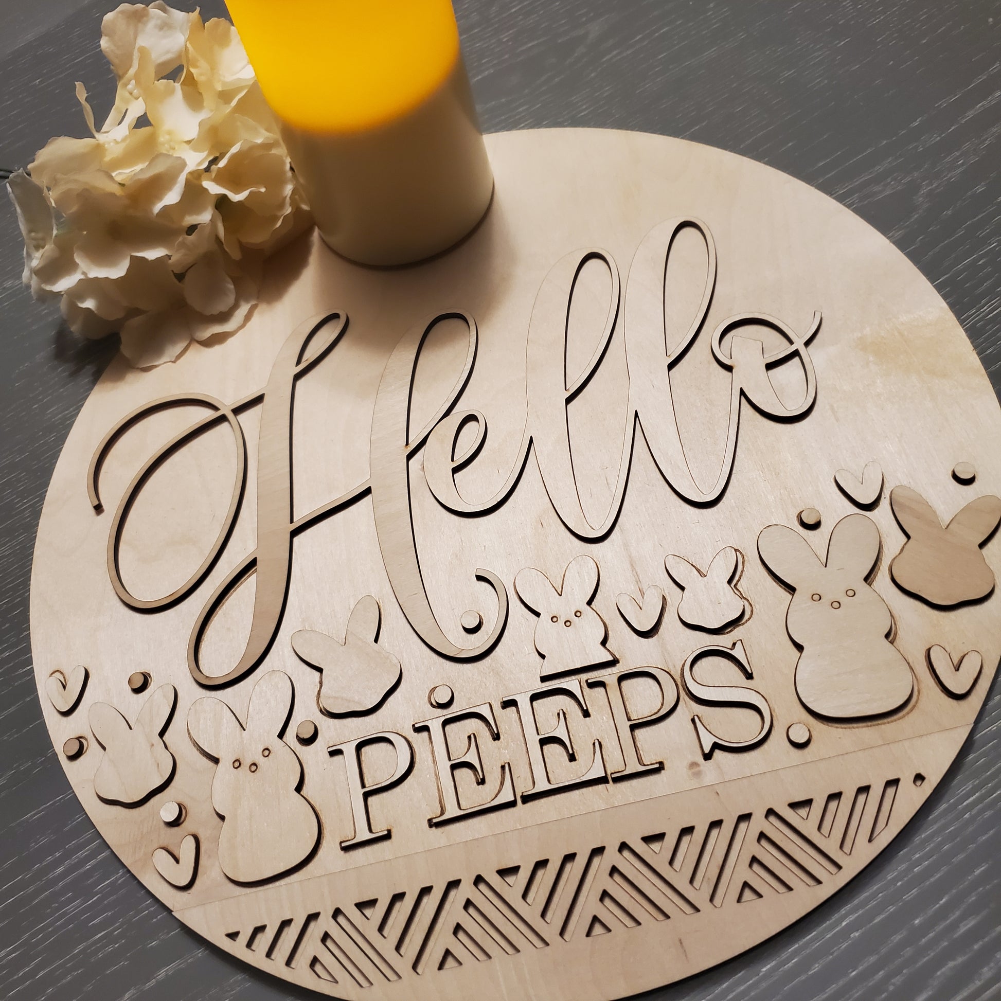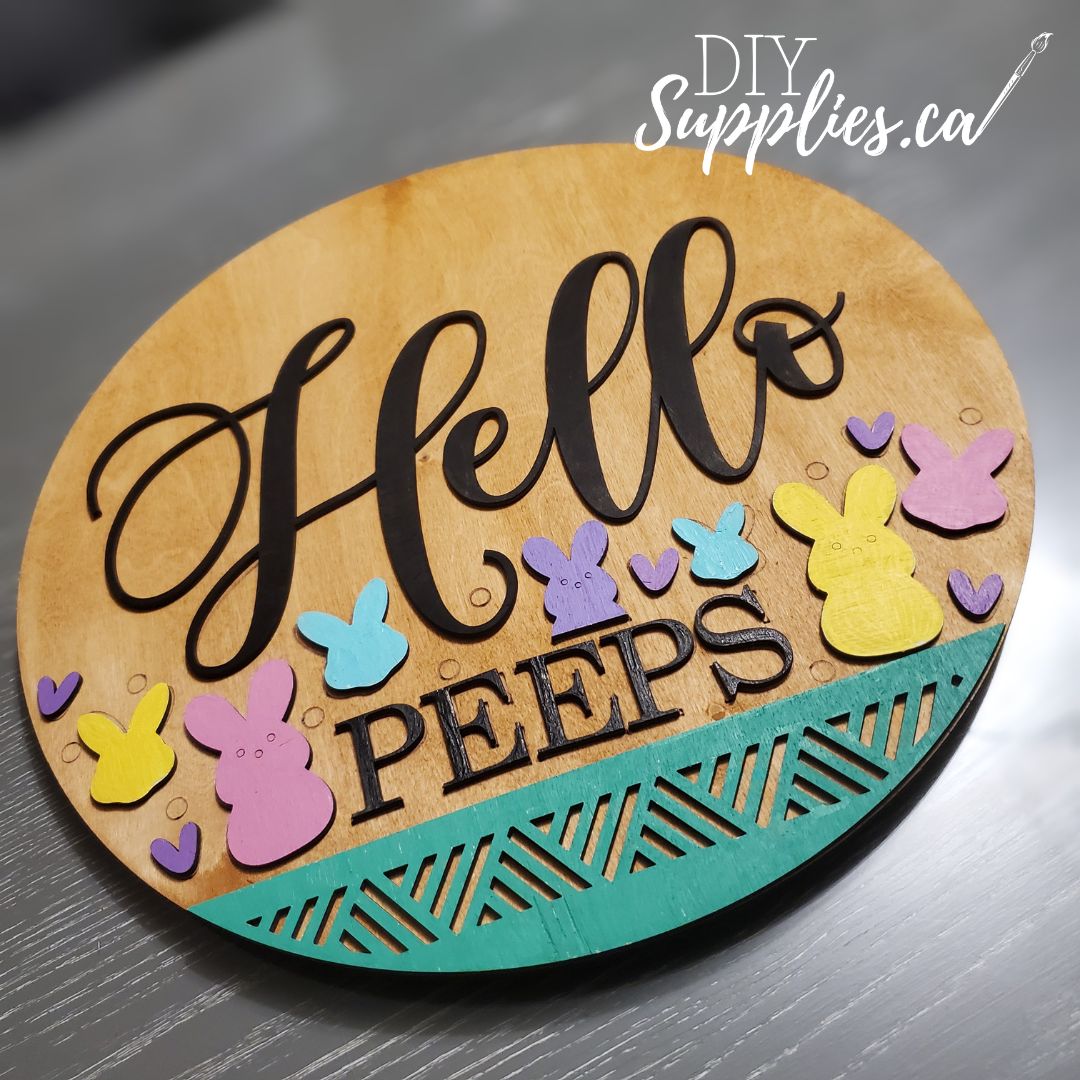 Ready to Paint, decoupage or stain. These sweet beaded circular sign blanks are ready for you to customize as you like with paint, gel pens, decoupage or stain. "Hello Peeps" and all the elements are precut so you can paint, stain decoupage, or use rub off transfers to decorate then glue together. These sets are unpainted and unglued. Pictures shown are of finished projects. Super fun and simple to customize! Use as a sign or attach a ribbon and bow to hang. They are 15 inch rounds.