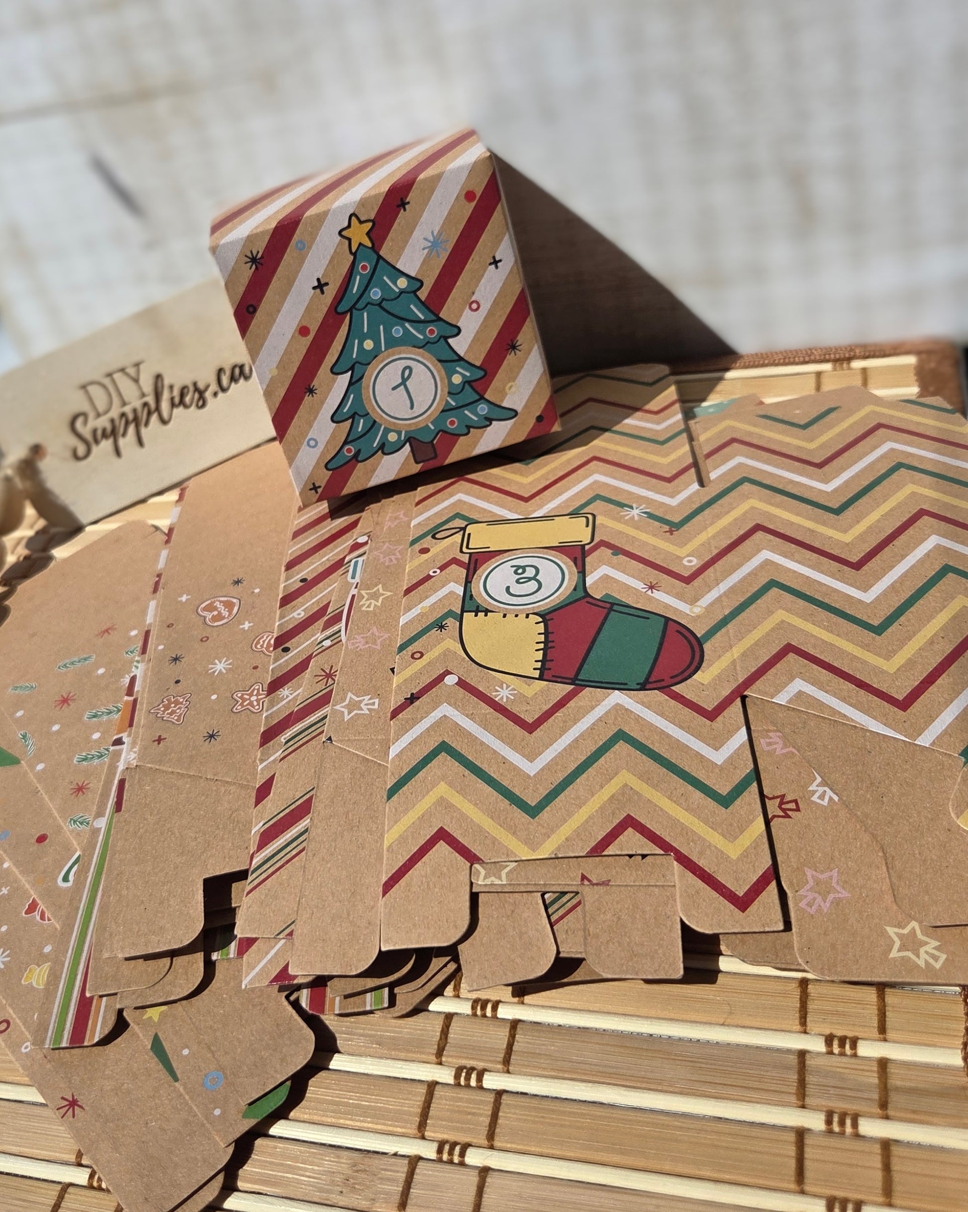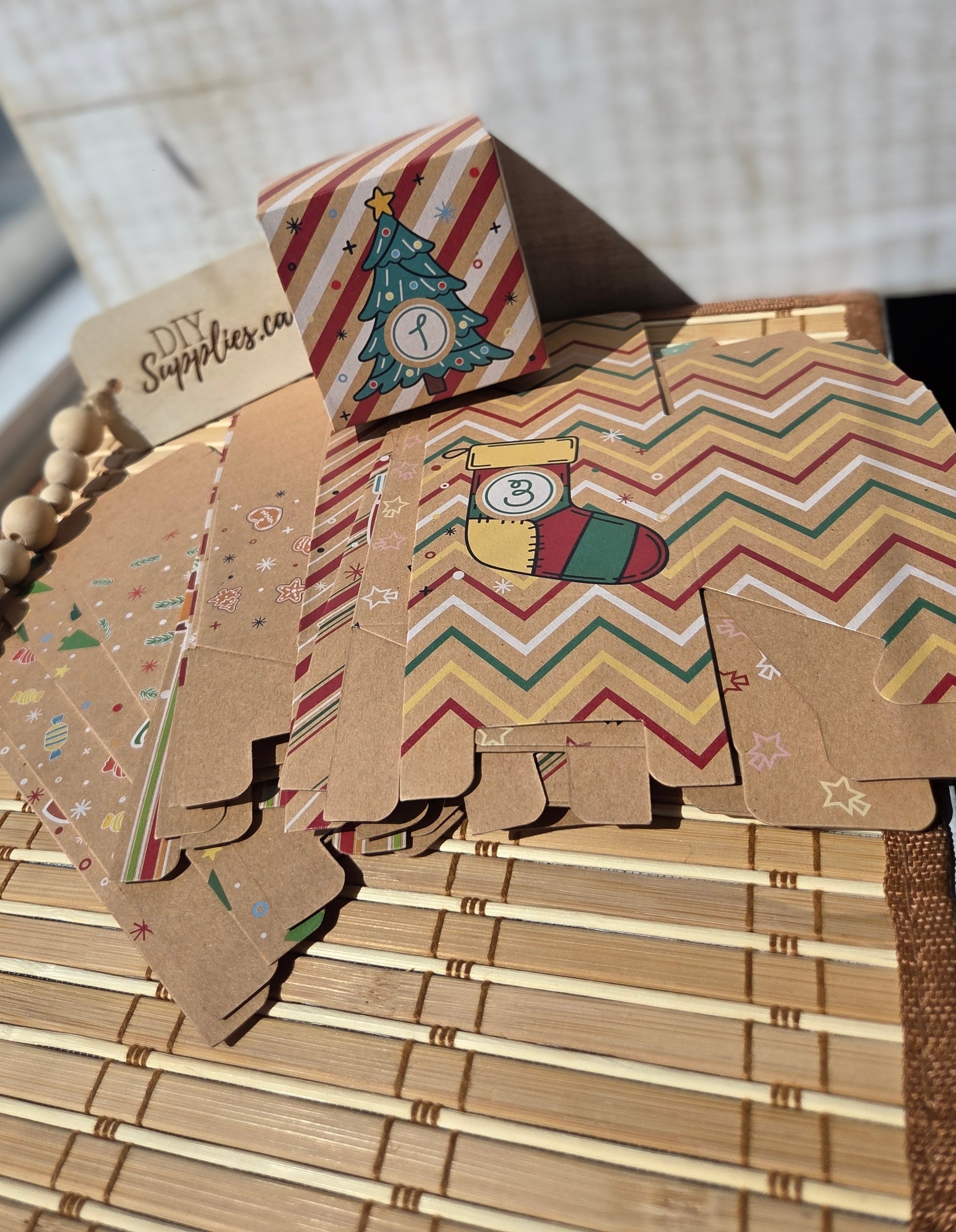 Kraft Christmas Mini Gift Boxes. Each box when folded becomes a 2.5 inch square gift box.