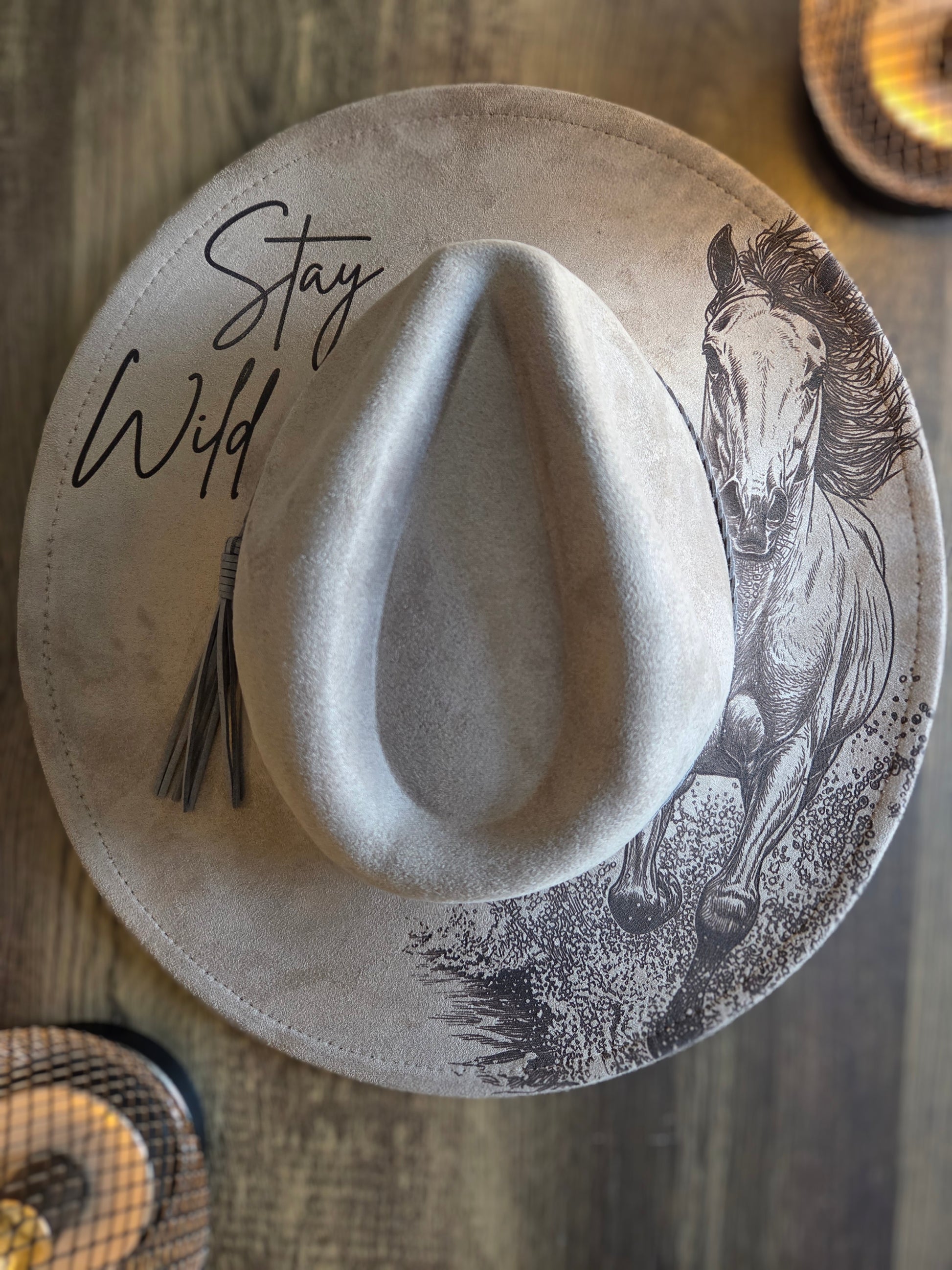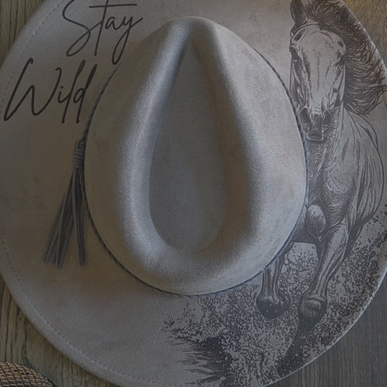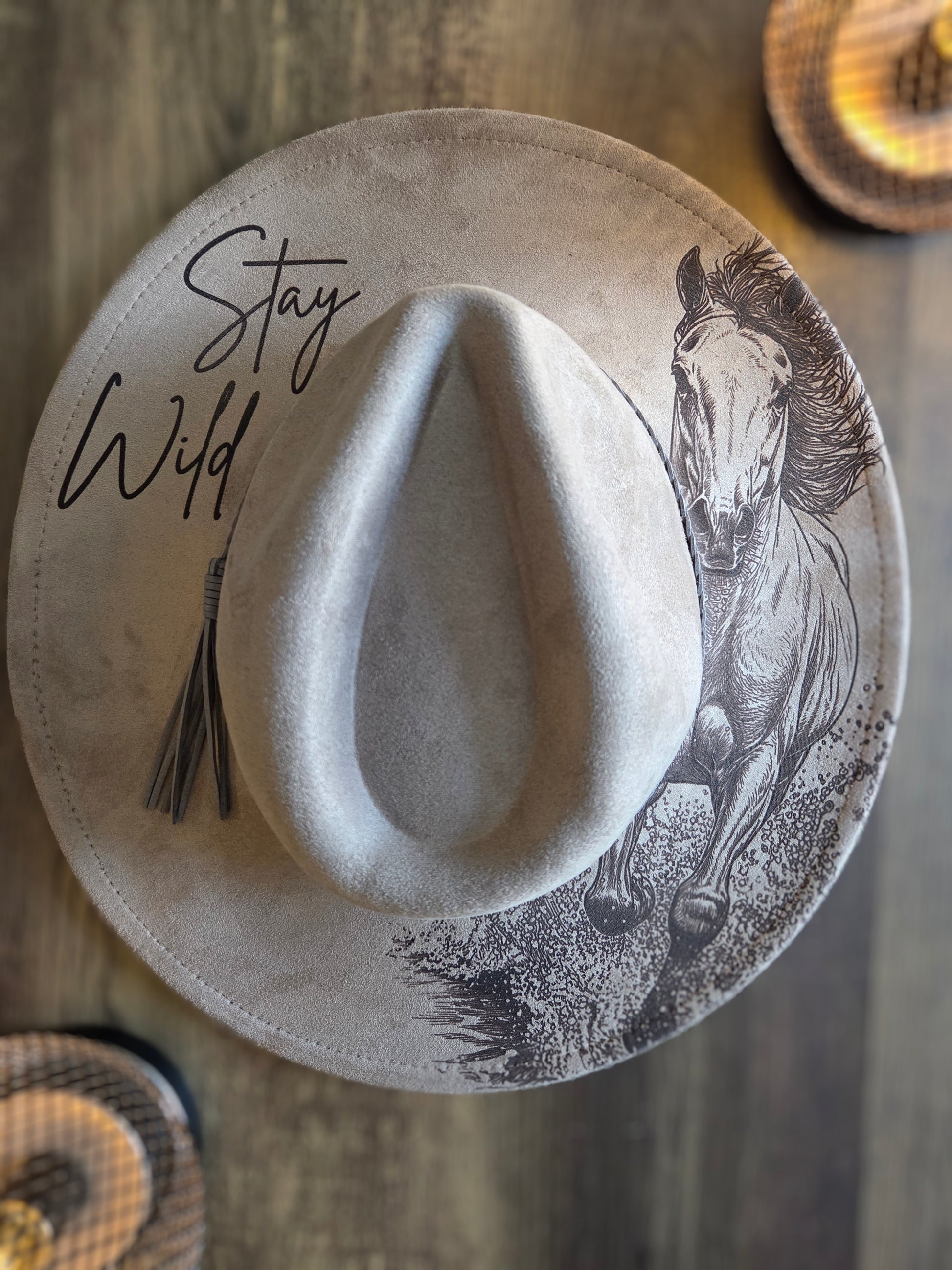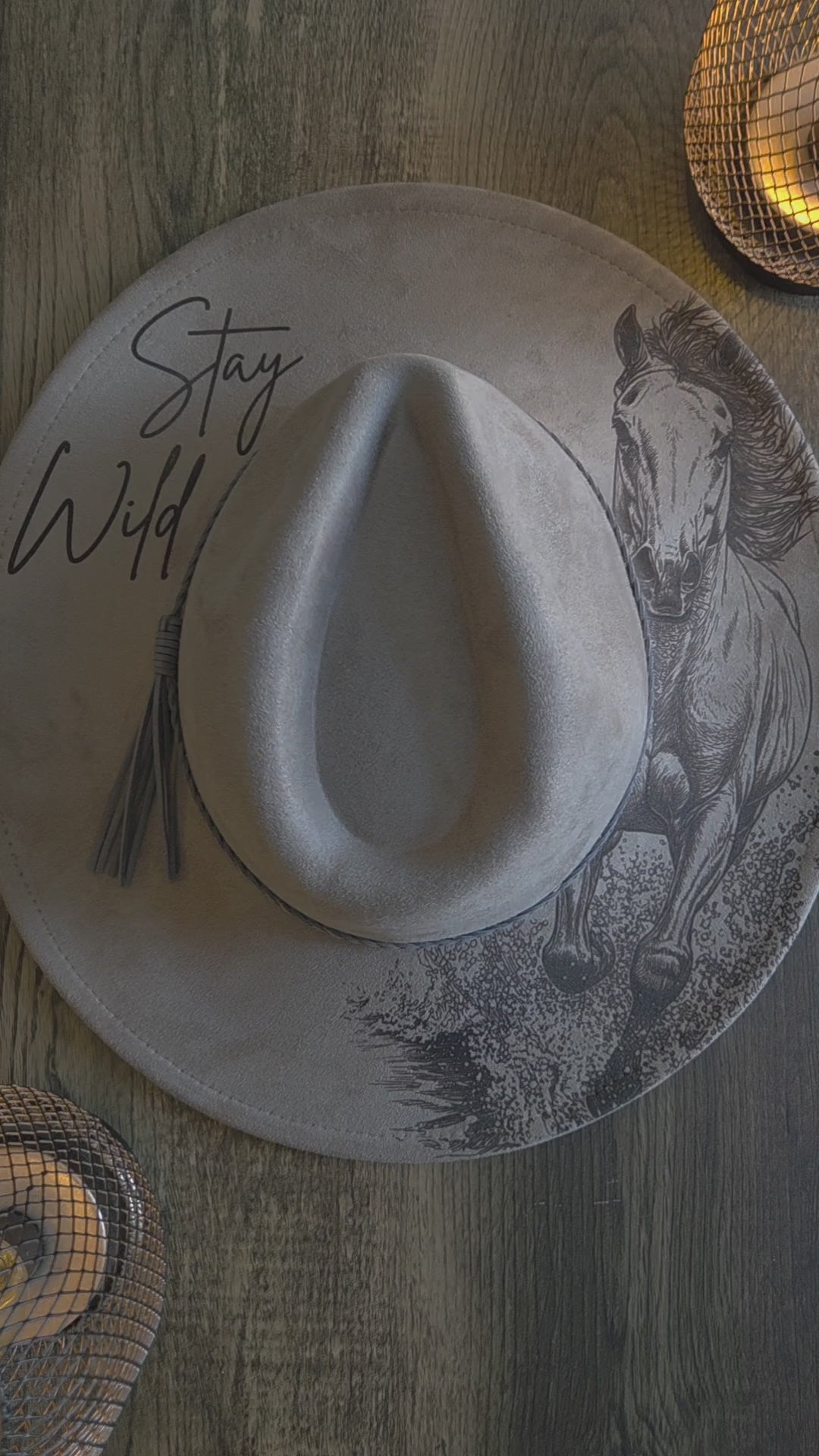 Let your creativity run free with our Stay Wild Ready-to-Paint Wide Brim Hat. This hat features a beautifully burnt showcasing a bold running horse paired with the inspiring phrase Stay Wild. The detailed burn lines create the perfect artistic base—giving you a clean, professional outline that’s ready for your personal touch.