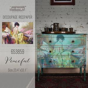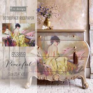 Re·Design Rice Paper. This beautiful sheet is a delicate, thin paper made from mulberry paper fibers, a renewable resource. Known for its beautiful ability to blend into any surface, Re·Design Rice Paper is perfect for collaging, and layering, to seamlessly blend onto your furniture, walls, and home decor pieces. Use to create one-of-a-kind, blended, and detailed pieces, with little or no thickness and texture. Re·Design Rice Paper features a delicate, thin composition, making it easier to cut and alter for even the smallest projects.