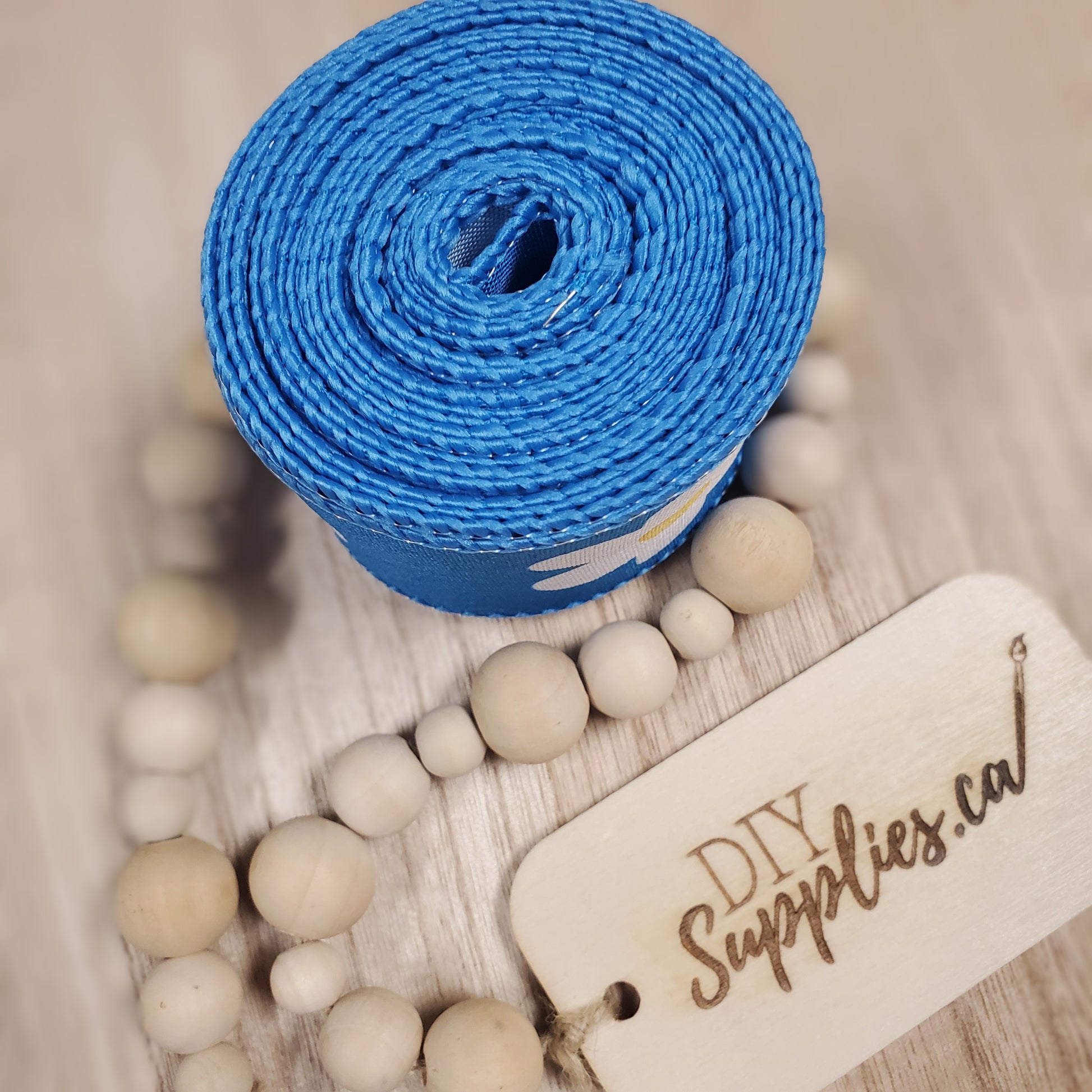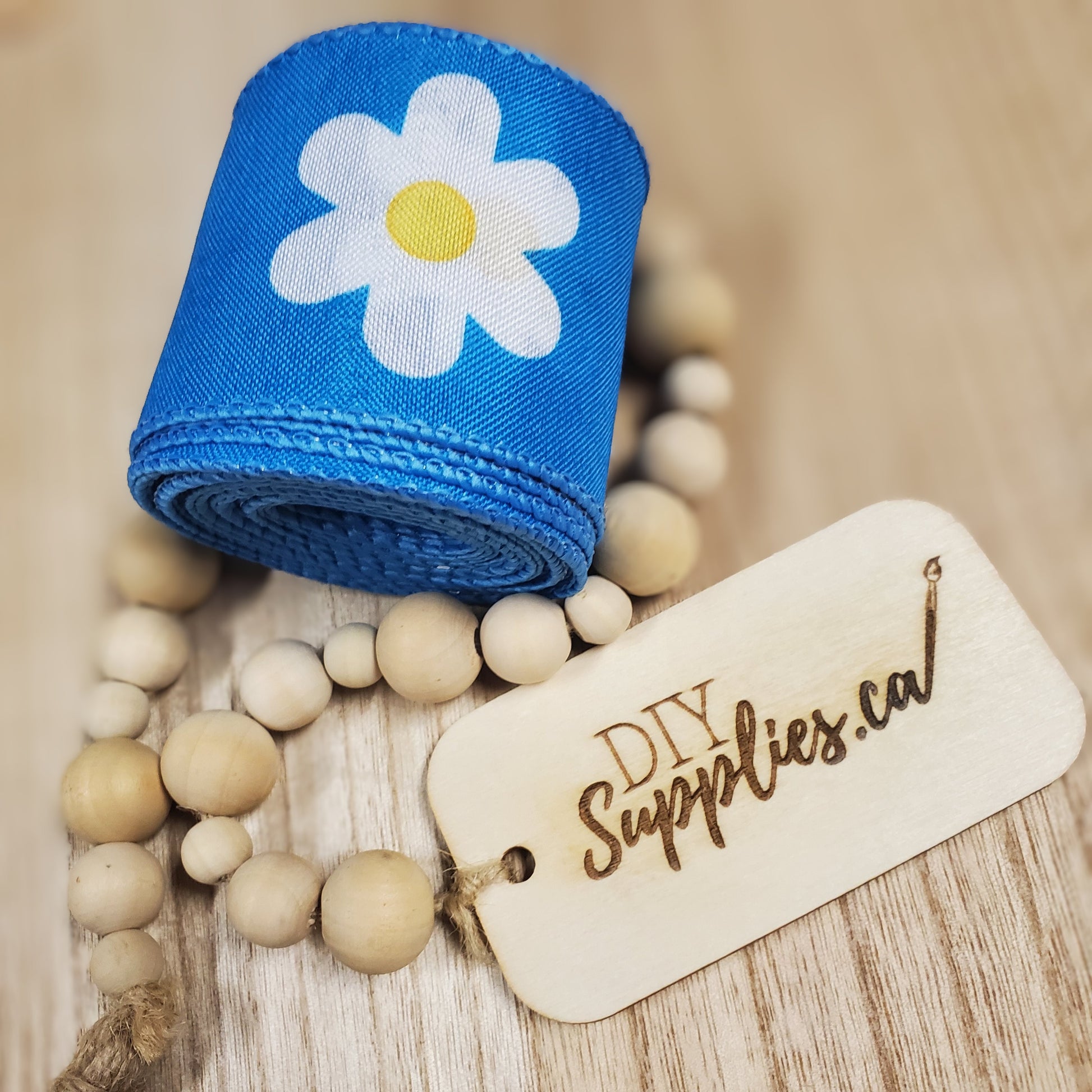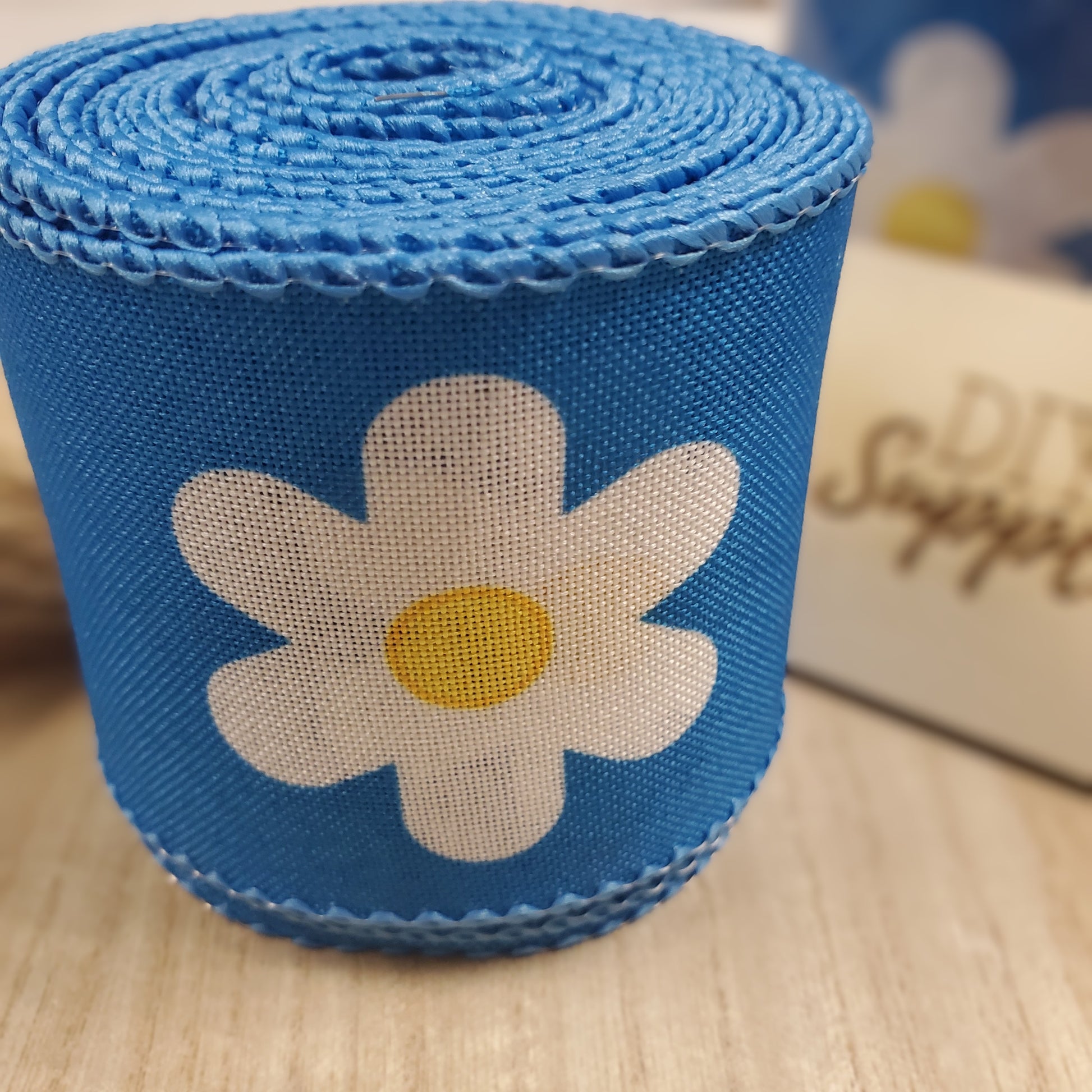 2.5 Inch x 10 Yds in Blue with a White Flower. It is perfect for sewing projects, wreaths, gift wrapping, or crafting projects. Nice spring ribbon!