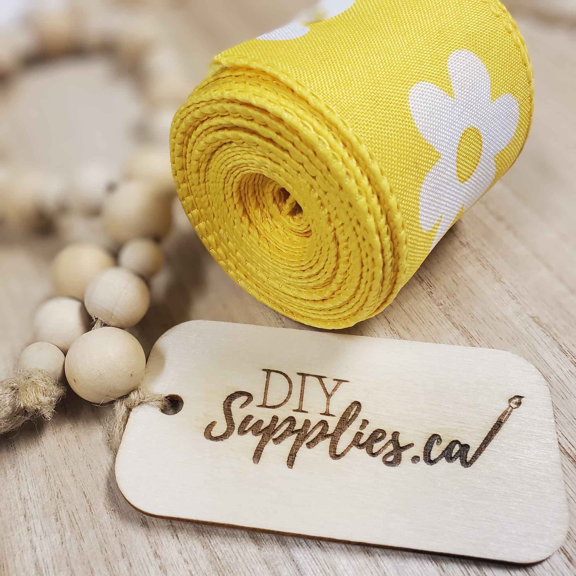 2.5 Inch x 10 Yds in Yellow with White Flower. It is perfect for sewing projects, wreaths, gift wrapping, or crafting projects. Nice spring colour!